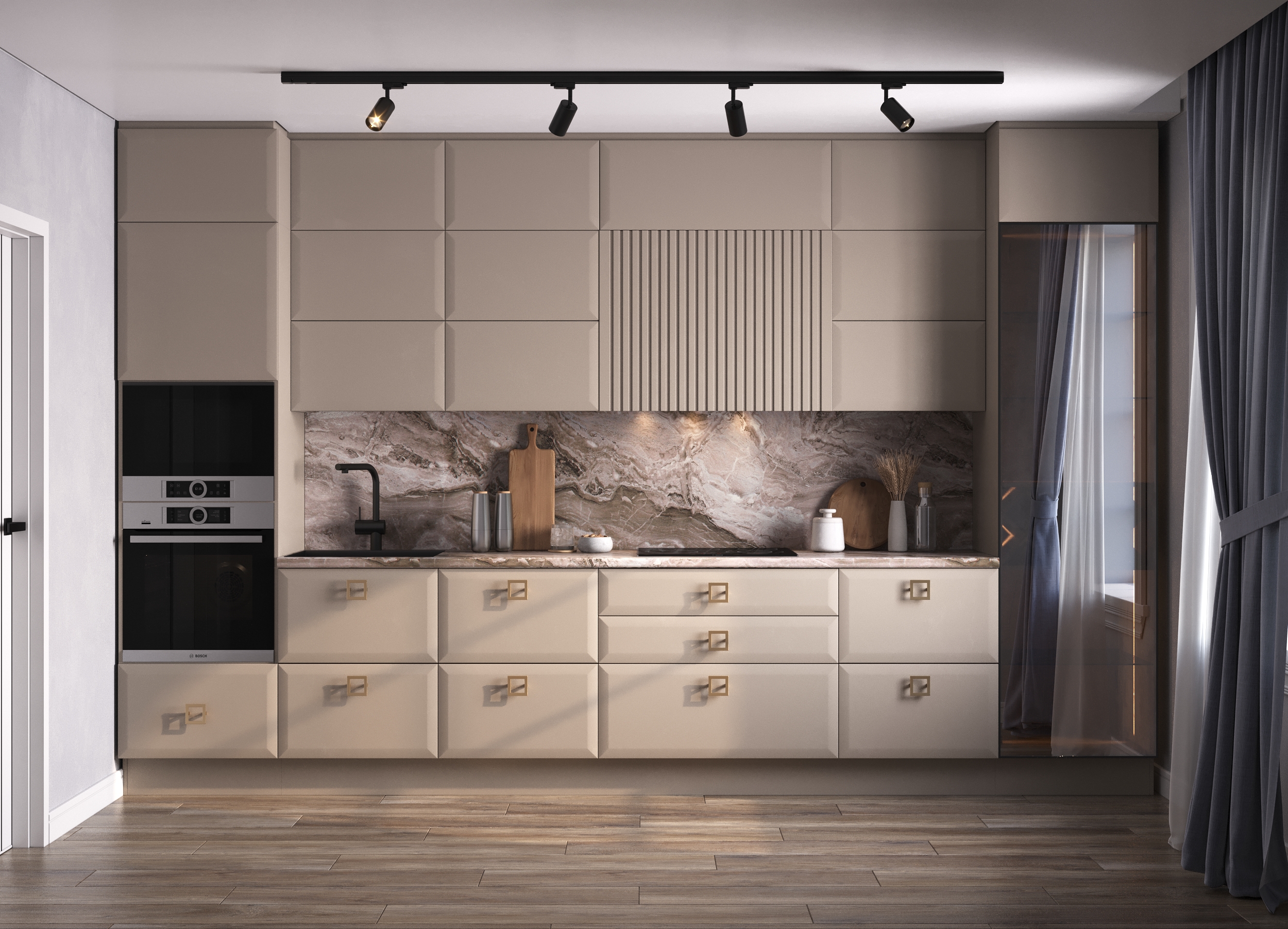 **Функциональность.** Гарнитур оснащён всем необходимым для комфортного приготовления пищи и хранения посуды.