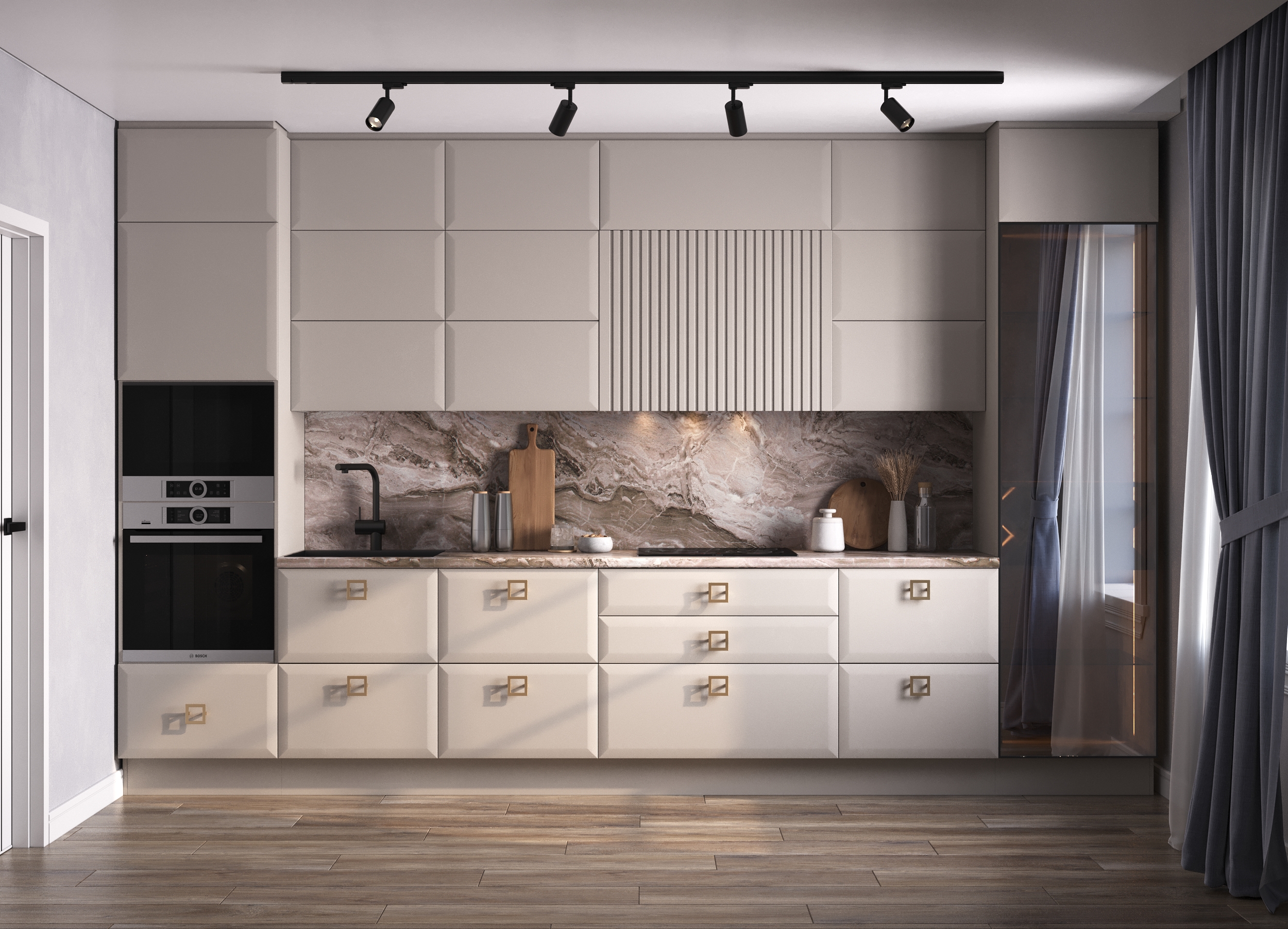 **Функциональность.** Гарнитур оснащён всем необходимым для комфортного приготовления пищи и хранения посуды.