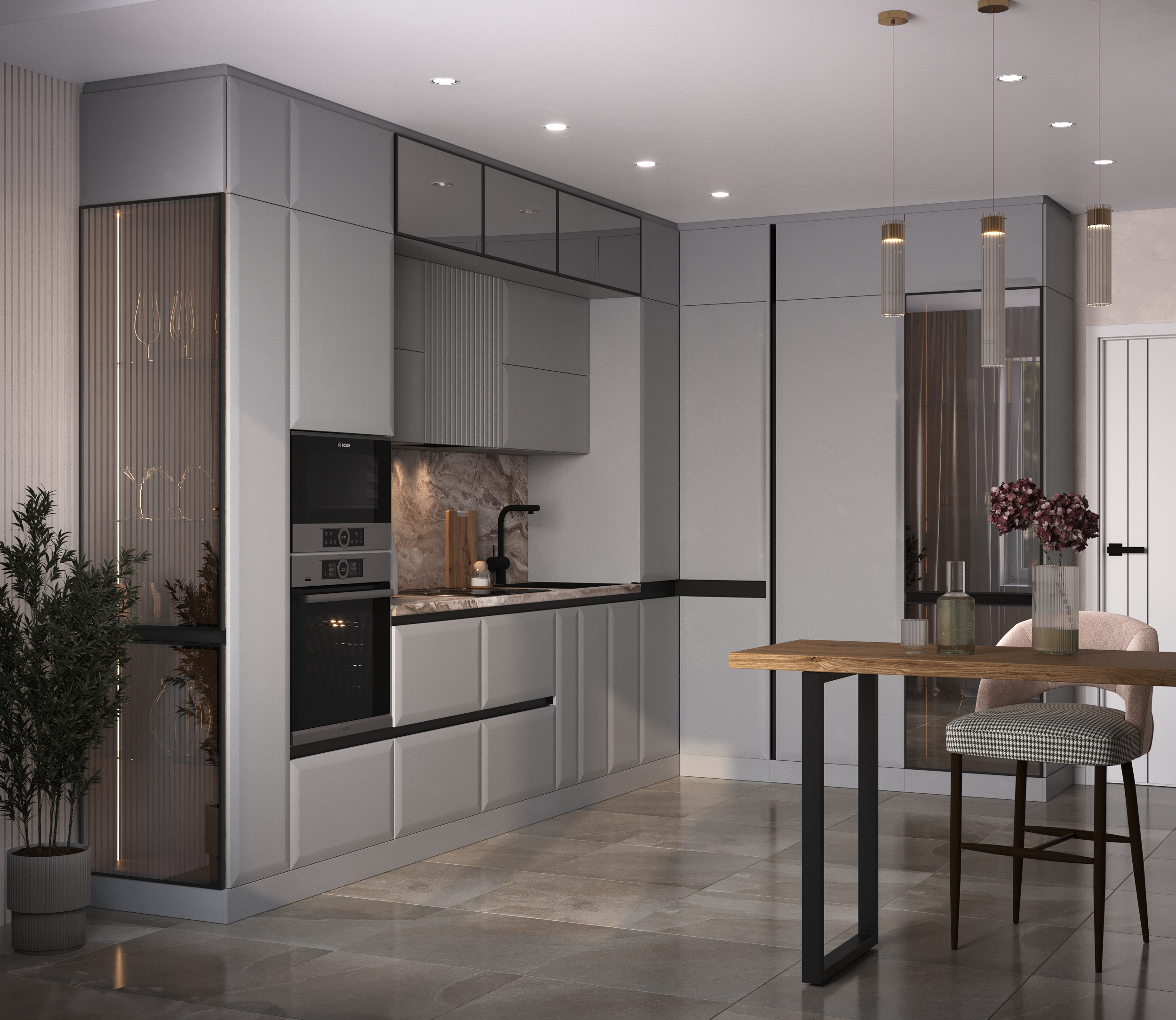 **Функциональность.** Гарнитур оснащён всем необходимым для комфортного приготовления пищи и хранения посуды.