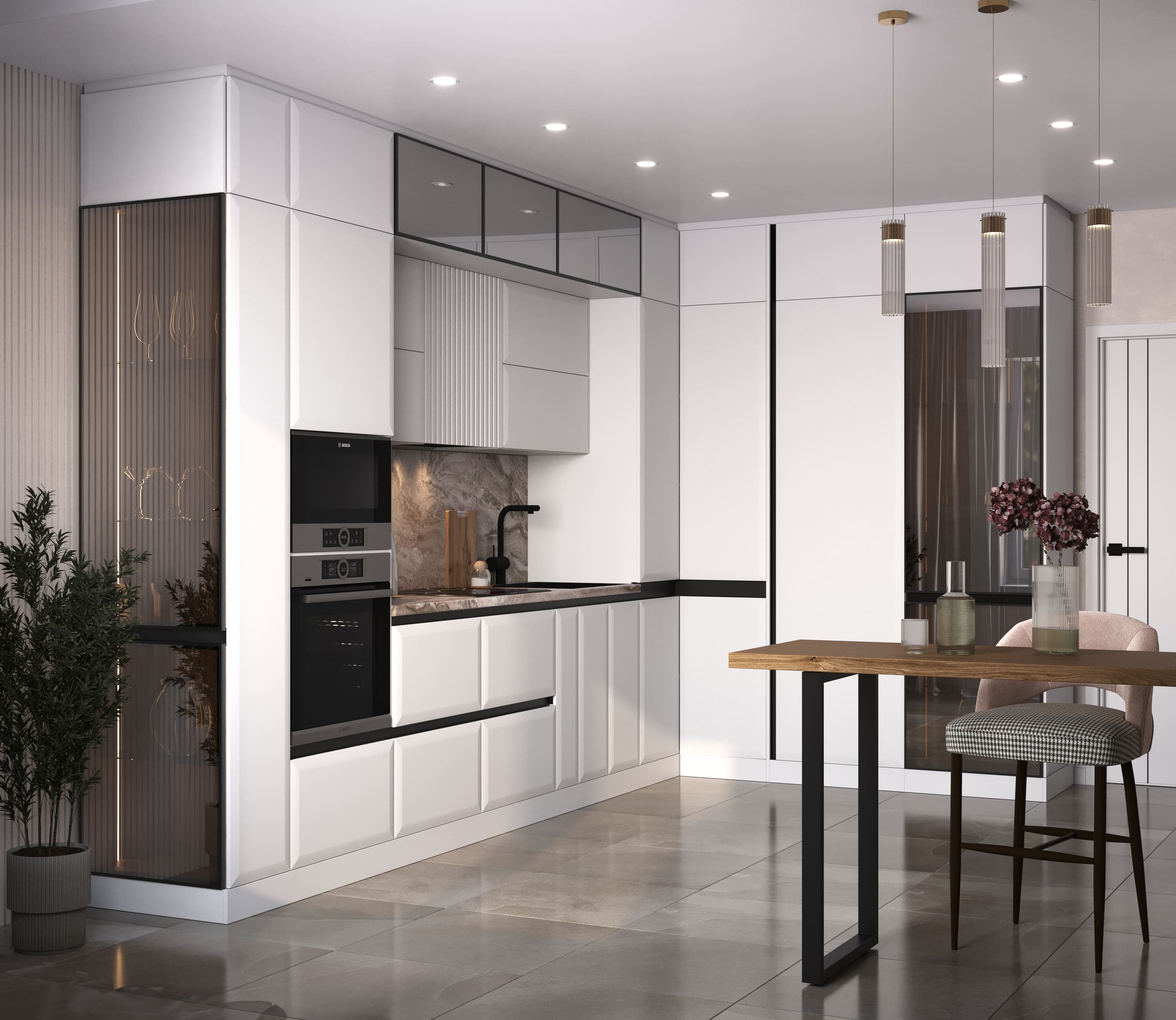 **Функциональность.** Гарнитур оснащён всем необходимым для комфортного приготовления пищи и хранения посуды.